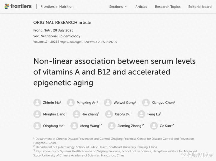 Non-linear association between serum levels of vitamins A and B12 and accelerated epigenetic aging; Front. Nutr., 28 July 2025.