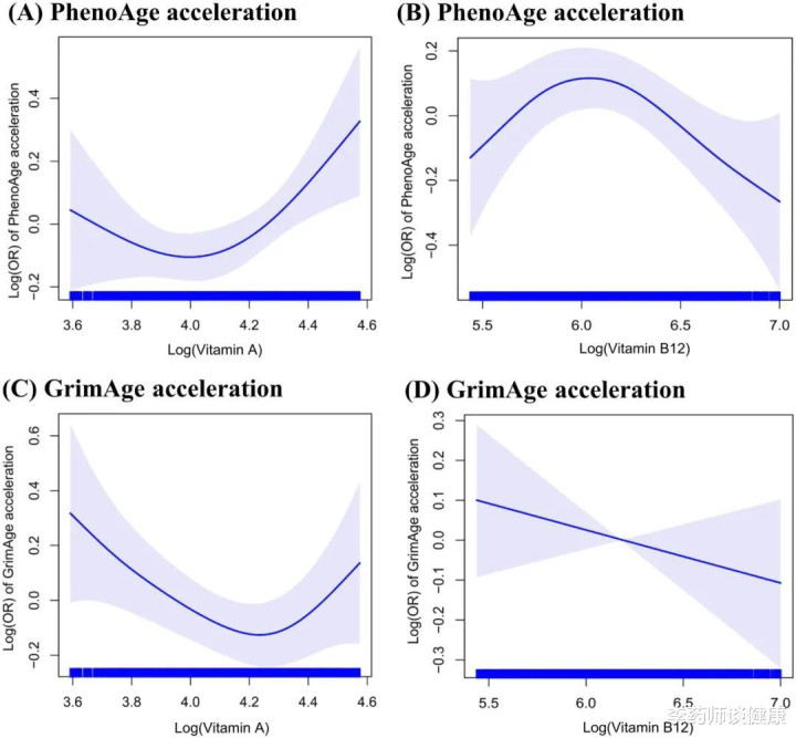 对于维生素B12则有所不同。研究发现,血清维生素B12水平与表观遗传年龄加速之间表现为一种“L”型关系,如果参与者的血清维生素B12水平低于488.0pg/ml,其水平与衰老之间没有显著关联性,但如果当维生素B12水平超过这个阈值后,血清维生素B12水平越高,人体的生物学年龄衰老速度就越慢,在此范围内,血清维生素B12水平每增加一个标准差,表观遗传衰老加速的风险降低了14%。