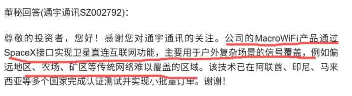 SpaceX供应商:公司在互动平台上表示,公司的MacrowiFi产品通过SpaceX接口实现卫星直连互联网功能。