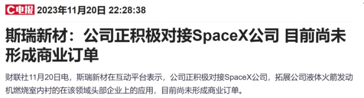 SpaceX供应商:公司积极对接SpaceX公司,拓展公司液体火箭发动机燃烧室内衬的在该领域头部企业上的应用,目前尚未形成商业订单。将充分受益SpaceX上市后业务扩大带来订单订单增量。