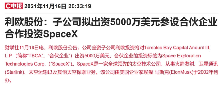 SpaceX参股方:公司全资子公司利欧投资将对Tomales Bay Capital Anduril III, L.P.(简称“TBCA”、“合伙企业”)出资5000万美元。合伙企业的投资标的为Space Exploration Technologies Corp.(“SpaceX”)。公司将充分受益SpaceX上市带来的投资收益。